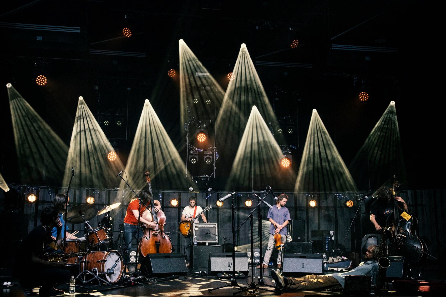 Oholo! is a conflict. Camaraderie without a final consensus. A collective of individuals. Mnogobolje (muchbetter), dissonance, polit-arsing, demo-cracking. Selves coming together in unlimited jazz. Boomers, but of the younger and middle-aged generation. Visions of the past. A reflection of the perpetual questioning of one and the same. However, Oholo! is also interminable action, the staking of sweaty bodies. Hitting a bare wall, just below the nail on which a painting once hung. Seven Snow Whites. Cotton swabs. Seven Dionysus’ goats. The offbeat septet is Oholo!